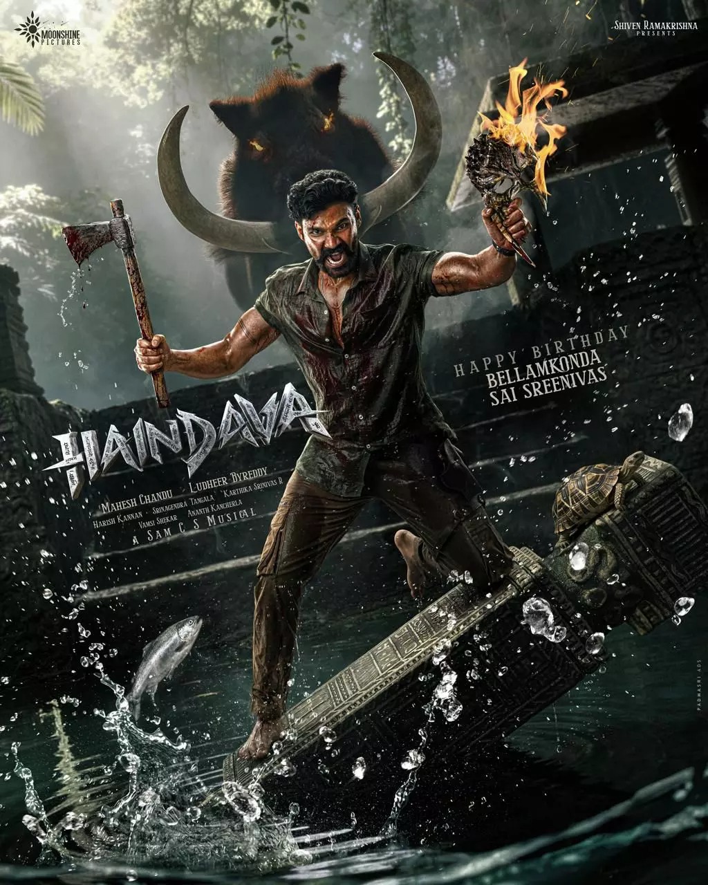 అయితే హ్యాట్రిక్ కొడతాడు అనుకున్న టైమ్ లో ‘టైసన్ నాయుడు’ సినిమా కాస్త డిలే అయ్యింది. ఈ సినిమాను 2026 సమ్మర్ రేస్ లో దించే ప్లాన్ లో ఉన్నారు. ఇదిలా ఉంటే, బెల్లంకొండ శ్రీనివాస్ పుట్టినరోజు సందర్భంగా ఒక అదిరిపోయే సర్ ప్రైజ్ ఇచ్చారు. తన కొత్త సినిమాకు సంబంధించి మరో పోస్టర్ ను రిలీజ్ చేశారు. ఈ సినిమాకు ‘హైందవ’ అనే పవర్ ఫుల్ టైటిల్ ను ఫిక్స్ చేసిన విషయం తెలిసిందే. పోస్టర్ డిజైన్, టైటిల్ ఫాంట్ చూస్తుంటేనే ఇదొక మిస్టరీ యాక్షన్ సినిమా అని అర్థమవుతోంది. మూన్ షైన్ పిక్చర్స్ బ్యానర్ పై లధీర్ బైరెడ్డి ఈ చిత్రాన్ని నిర్మిస్తుండగా, మహేష్ చందు దర్శకత్వం వహిస్తున్నారు. రిలీజ్ చేసిన ఫస్ట్ లుక్ పోస్టర్ చాలా ఇంటెన్స్ గా ఉంది. అన్నింటికంటే హైలైట్ ఏంటంటే.. హీరో వెనకాల దశావతారాల్లో ఒకటైన వరాహ రూపం ఉగ్రంగా కనిపిస్తుండటం. హీరో చేతిలో కాగడా, గొడ్డలి పట్టుకుని నీటిలో ఉన్న ఒక పురాతన స్తంభంపై నిల్చొని ఉండటం చూస్తుంటే గూస్ బంప్స్ వస్తున్నాయి. క్యాప్షన్ లో “సత్యాన్వేషణలో అతను ఒంటరి కాదు.. దశావతారాలు అతనికి అండగా ఉంటాయి” అని చెప్పడం ఆసక్తిని రేకెత్తిస్తోంది. ఈ మధ్య కాలంలో ‘కాంతార’, ‘హనుమాన్’, ‘కార్తికేయ 2’ లాంటి దైవ సంబంధిత కథలకు పాన్ ఇండియా రేంజ్ లో క్రేజ్ పెరుగుతోంది. ఇప్పుడు బెల్లంకొండ కూడా అదే ట్రెండ్ ని ఫాలో అవుతూ, డివైన్ టచ్ ఉన్న యాక్షన్ కథను ఎంచుకున్నట్లు క్లియర్ గా తెలుస్తోంది. ‘శ్యామ్ సి ఎస్’ సంగీతం అందిస్తున్న ఈ సినిమా బెల్లంకొండ కెరీర్ లోనే బిగ్గెస్ట్ హిట్ అయ్యే ఛాన్స్ ఉంది.